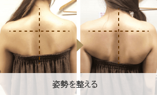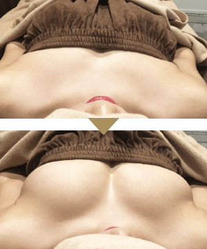 股関節がズレ骨格がゆがむと、猫背になってしまいます。そうすると首も前傾し、頭も前にズレるため、あごが下がり、それこそがバストが下がり背中にバストが逃げてしまう原因なのです。Rococoのバストケアは首・肩・背中・肩甲骨周りをしっかりお手入れし、美しい姿勢をサポートする施術やアイテムも多数そろえています。